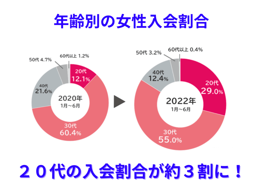 公式データによると、2020年時点で12.1 %だった20代女性の入会割合は、2022年には29.0 %にまで上昇しました。※1